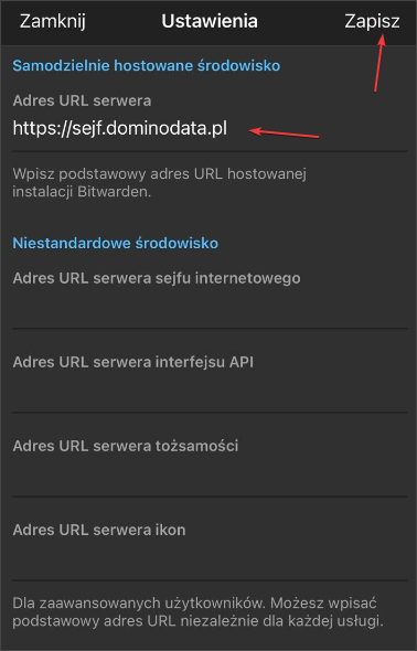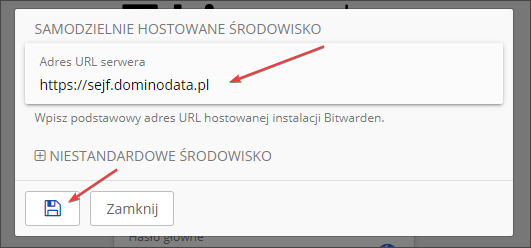 następnie, wpisz Adres URL Serwera: https://sejf.dominodata.pl i klinij zapisz
