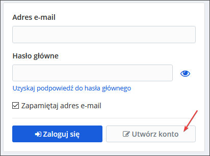 Pierwszym krokiem jest rejestracja - utworzenie konta/sejfu. Aby to zrobić kliknij wejdź na stronę sejf.dominodata.pl i kliknij "Utwórz konto"