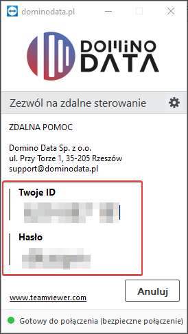 - Uruchom zapisany wcześniej plik i podaj dane połączenia (Twoje ID i hasło) naszemu inżynierowi (np. przez telefon)